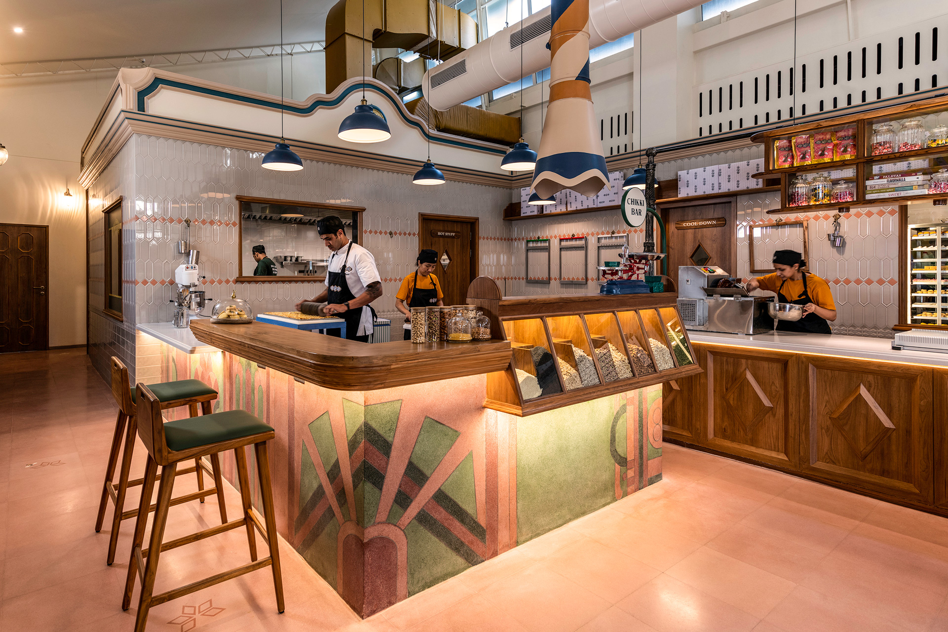At its heart is the ‘Mithai bar’, framed by cast iron columns and curved glass cases, recalling vintage snack stalls. A 20-foot finishing counter allows chefs and customers to interact, while the ‘Chikki bar’ offers customization on terrazzo counters cast in pista and rose hues. Viewing windows reveal the buzzing ‘Hot Mess’ kitchen, turning production into spectacle.