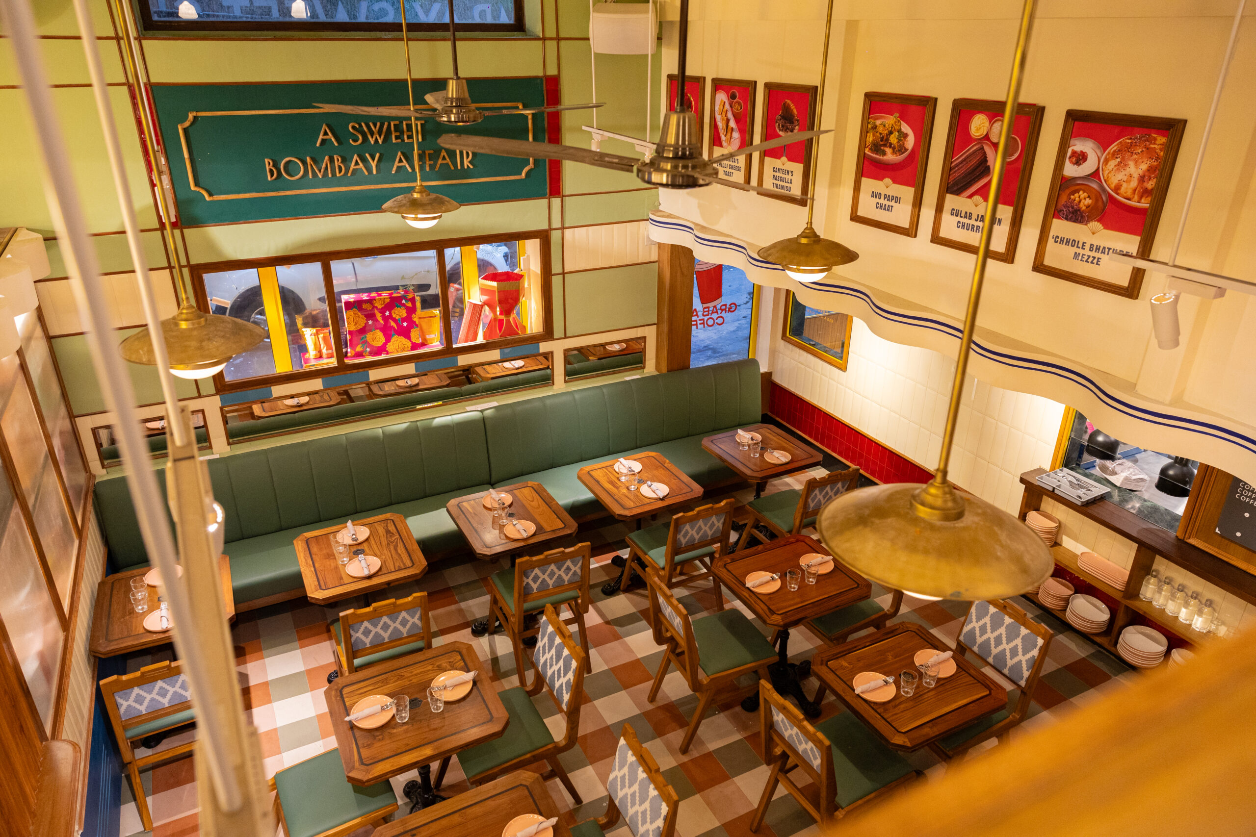 At Bombay sweet shop we have always been inspired by the luring idea of snack stalls at the art deco theatres of bombay. The mithai bar is a nod to the historical concession stands. The use of glazed tiles, antique art deco lights and teak wood panelling reference the heritage of the neighbourhood.